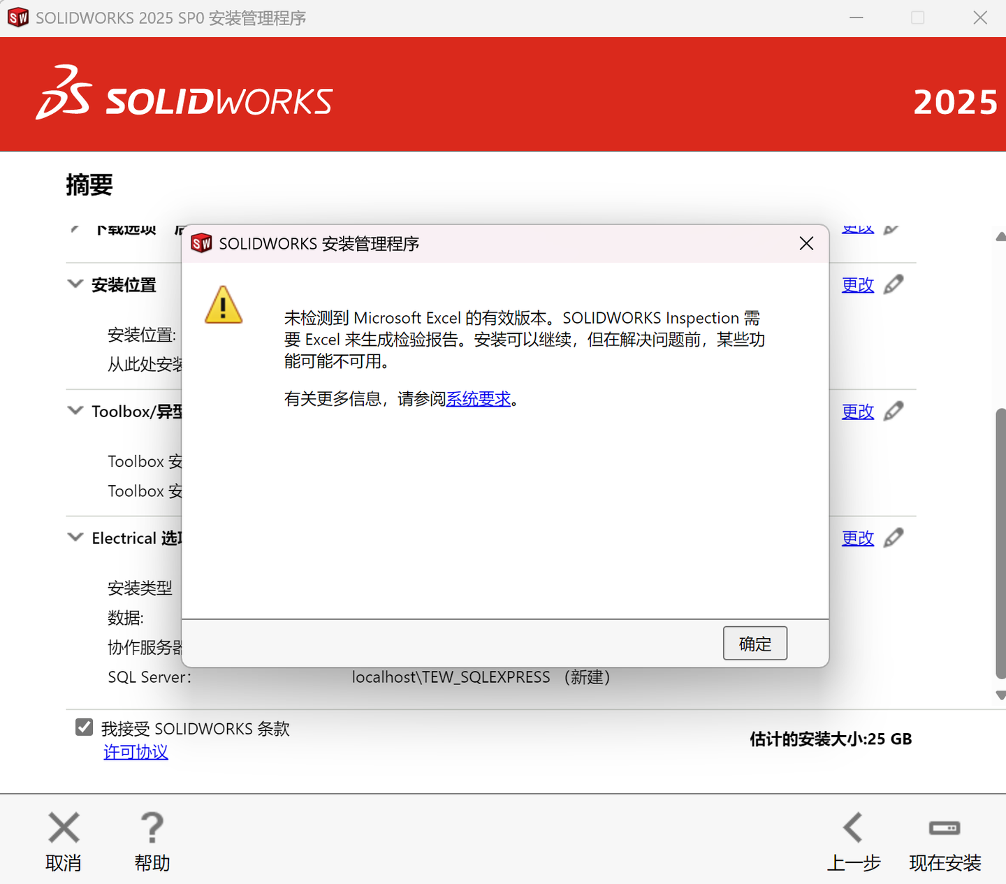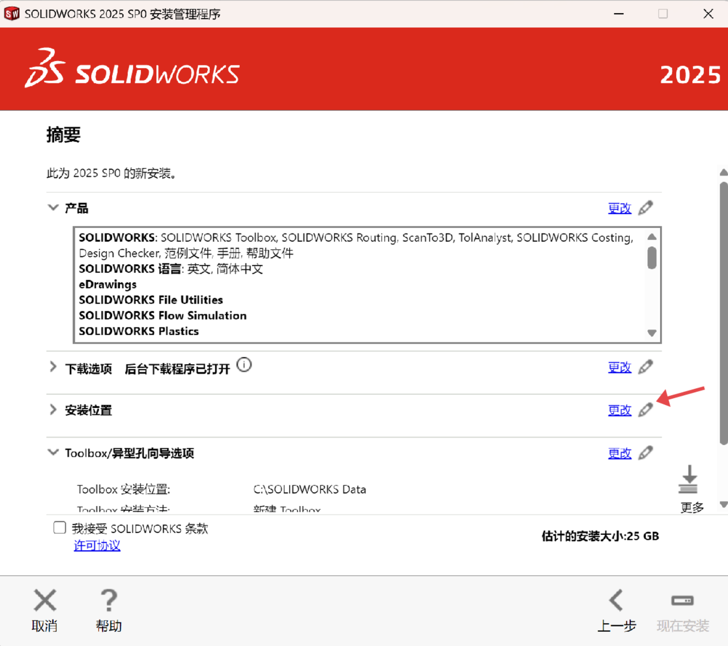 勾选我接受 SOLIDWORKS 条款,点击现在安装: