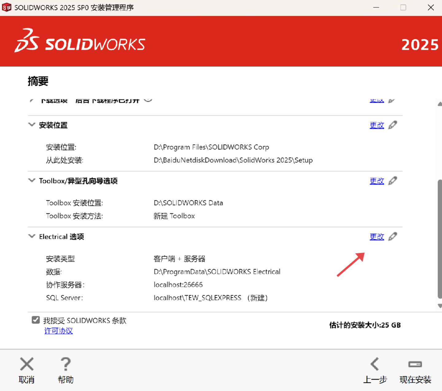 点击“Electrical选项”(若勾选了该产品,没有勾选可忽略此步)右边的更改: