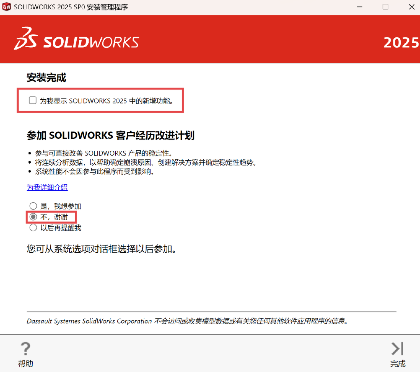 取消勾选【为我显示……新增功能】,选择【不,谢谢】,点击完成: